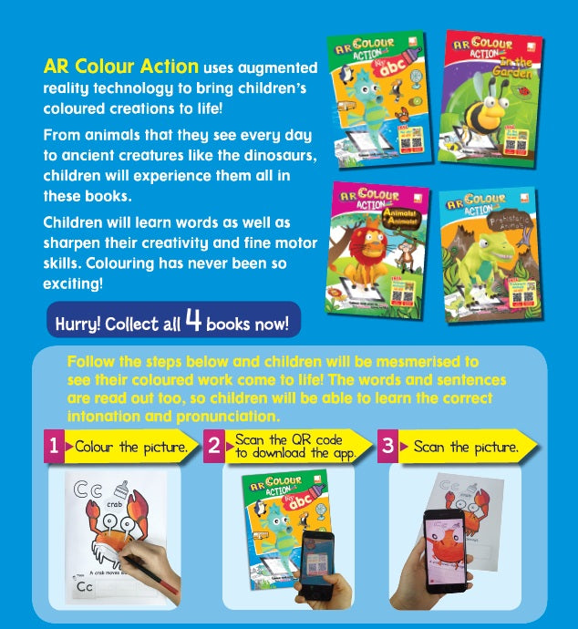 AR Colour Action uses augmented reality to animate children's colored creations, bringing everyday animals and dinosaurs to life, enhancing vocabulary, creativity, and fine motor skills in an exciting coloring experience!