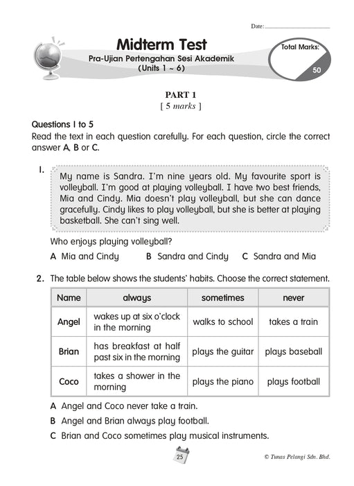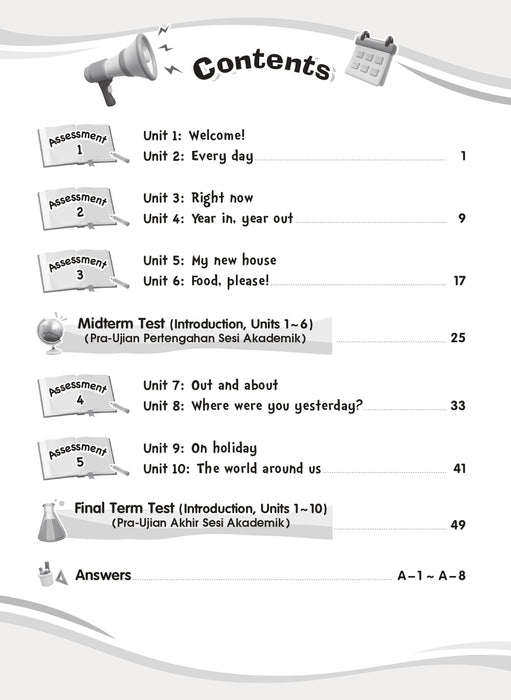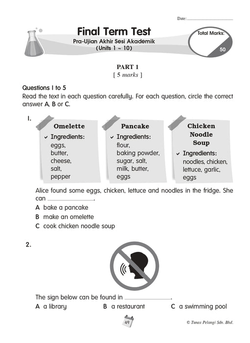 Aligned with the latest national syllabus (DSKP) and textbooks. Each test focuses on 1–2 units to evaluate students’ understanding of language skills (listening, speaking, reading, writing) and key topics taught in class. It includes unit-based quizzes, midterm exams, and final year-end assessments to help track learning progress. Complete answers are provided to make grading and revision quick and easy for teachers, students, and parents.